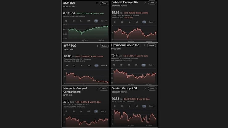 In an irony that’s almost poetic, the S&P 500 is up more than 13 percent this year , yet every major advertising holding company is in the red.